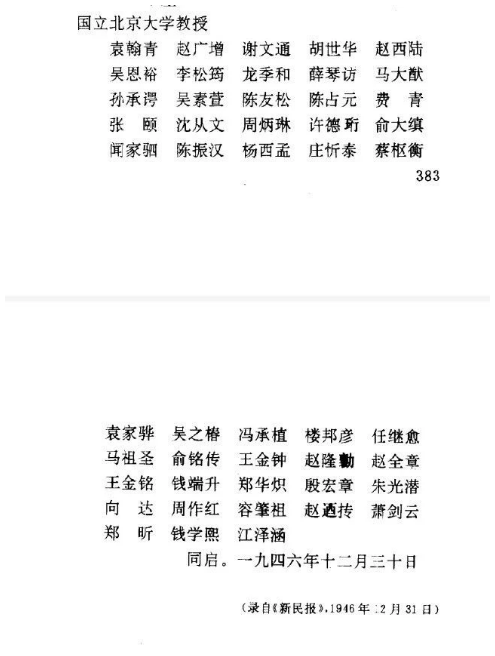 12月30日,北大48名教授写联名信登报,抗议美军暴行。教授们在登报前请校长胡适牵头署名,但平时高喊“爱自由,爱北大,爱学生”的胡适接到消息后,却拒绝署名。所以,教授联名信登报后,没有校长胡适的名字。